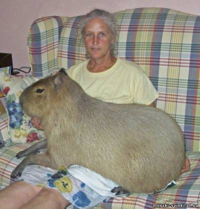 | Капібара Капібара, або водосвинка (Hydrochoerus Hydrochaeris), належить до сімейства капібар, або водосвинок (Hydro-choeridae), до складу якого входить лише один рід з двома видами. Є найкрупнішим гризуном в світі. Досягає в довжину 1,25 м і ваги в 50 кг Шкура капібари, або водосвинки, покрита бурою з рудуватим відтінком щетинистою шерстю. Кінцівку досить довгі, морда, що тупо закінчується, вуха короткі. Між пальцями є плавальні перетинки, завдяки чому капібара, або водосвинка, чудово плаває і упірнає. Бігає не дуже швидко, але, будучи переляканою, в змозі тікати блискавичними стрибками. Живе в лісистій місцевості поблизу річок в екваторіальній частині Південної Америки, на сході від Анд. Її основними ворогами у воді є алігатори, а на суші — ягуари. Виходить на здобич прожитку вдень і вночі. Харчується травою, корою, водяними рослинами. Раз на рік самка після вагітності, що триває 104—111 днів, народжує 3—8 дитинчат, які швидко стають самостійними.На батьківщині, в Південній і Центральній Америці, цей гризун називається капібара (Hydrochoeridae capybara), а також корпінчо, капрінчо, капігуа, пончо або чигуїре. У багатьох місцях на капібару полюють із-за м'яса, і їх чисельність зменшується. Спіймані звіри швидко стають ручними і можуть дружити навіть з собаками. Люди, тримаючі капібар в неволі, відзначають дивовижну лагідність тварин. От як описує капібару в своєму творі "Гончаки Бафута" Дж. Даррелл: "... капібари примітні тим, що вони найкрупніші гризуни на Землі. Що це означає, можна зрозуміти, лише порівнявши їх з яким-небудь з їх родичів подрібніше. Доросла капібара досягає чотирьох футів в довжину, її зростання два фути, вага до ста з гаком фунтів. Адже це просто громадина поряд з мишею-малятком, в якій всього лише чотири з половиною дюйми від хвоста до кінчика носа, а вага біля однієї шостої унції! Цей гігантський гризун є жирним звіром з довгастим тілом, покритим жорсткою кошлатою шерстю строкатого коричневого забарвлення. Передні лапи у капібари довше задніх, масивний огузок не має хвоста, і тому у неї завжди такий вигляд, ніби вона ось-ось збирається сісти. У неї крупні лапи з широкими перетинковими пальцями, а кігті на передніх лапах короткі і тупі, такі, що дивно нагадують мініатюрні копита. Вигляд у неї вельми аристократичний: її плоска широка голова і тупа, майже квадратна морда мають благодушно-покро-вітельноє вираз, схожість, що додає нею, із задумливим левом. По землі капібара пересувається характерною човгаючою ходою або скаче перевалюючись галоп, у воді ж плаває і упірнає з вражаючою легкістю і спритністю.Капібара — флегматичний добродушній вегетеріа-нец, озброєний здоровенними яскраво-оранжевими різцями, гострими і широкими, немов складаний ніж, позбавлений яскравих індивідуальних рис, властивих деяким його родичам, але цей недолік заповнюється у неї спокійною і доброзичливою вдачею". Гризнчики.ua